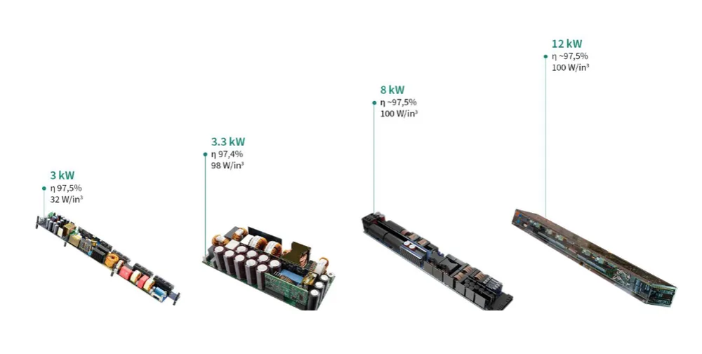 数据中心内功率密度加速上升,大约十年前,每个机架的平均功率密度约为4至5 kW,但当今的超大规模云计算公司(例如亚马逊、微软或Facebook)通常要求每个机架的功率密度达到20至30 kW。一些专业系统的要求甚至更高,要求每个机架的功率密度达到100kW以上。因电源存放及散热空间有限,高功率密度要求电源设计紧凑且高能效,同时电源还需满足数据中心行业特定需求,如AI数据中心PSU需符合严格的Open Rack V3(ORV3)基本规范。近期新型AC-DC PSU标称输入范围200至277VAC,输出50VDC,ORV3标准要求在30%至100%负载条件下峰值效率超97.5%,10%至30%负载条件下最低效率达94%。