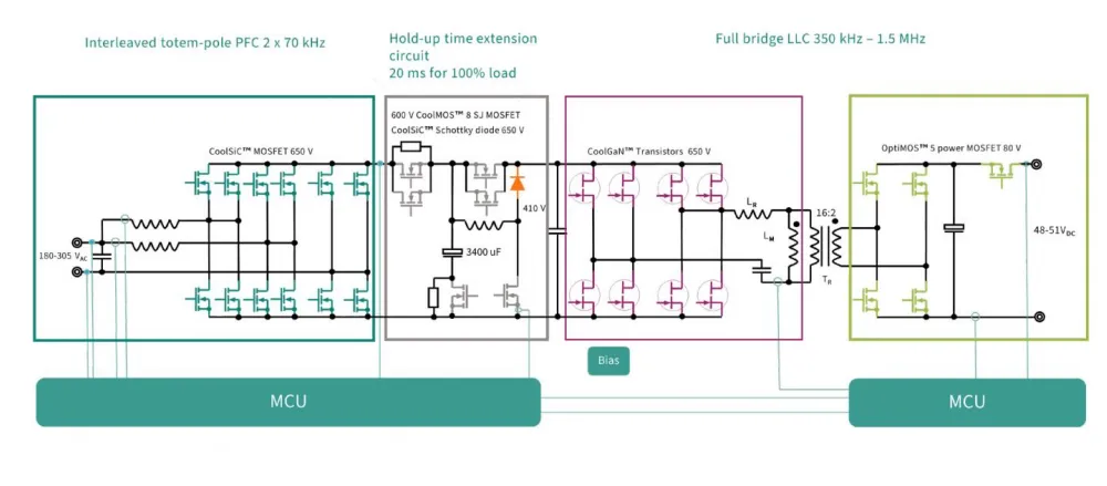 无桥图腾柱PFC级:该参考板的无桥图腾柱PFC级采用碳化硅,有助于提高效率和可靠性。无桥图腾柱PFC拓扑能够减少传统PFC拓扑中桥式整流器的功率损耗,从而提升整体效率。比如在满足80 Plus钛金认证(要求端到端峰值效率超过96%,意味着PFC级效率必须高于98.6%)时,传统PFC拓扑因桥式整流器功率损耗难以达到这一标准,而无桥图腾柱PFC拓扑仅需一个PFC电感,且能在整个交流周期内进行升压操作,可实现高功率密度和高效率的PSU设计。