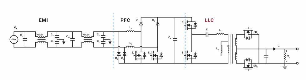 功率因数校正(PFC)级是PSU中AC-DC转换的关键组成部分,对于实现高能效非常重要。PFC级负责整形输入电流,以尽可能放大有用功率与总输入功率之比。为满足IEC 61000-3-2等法规中的电磁兼容性(EMC)标准,并确保符合ENERGY STAR®等能效规范,PFC设计也是关键所在。