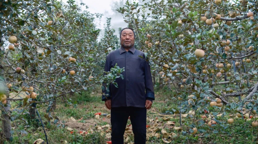 赵先念站在自己的苹果园中,他担心明年是否还有体力为苹果套袋,孩子在外地工作,没时间回来帮忙,他和老伴都老了。