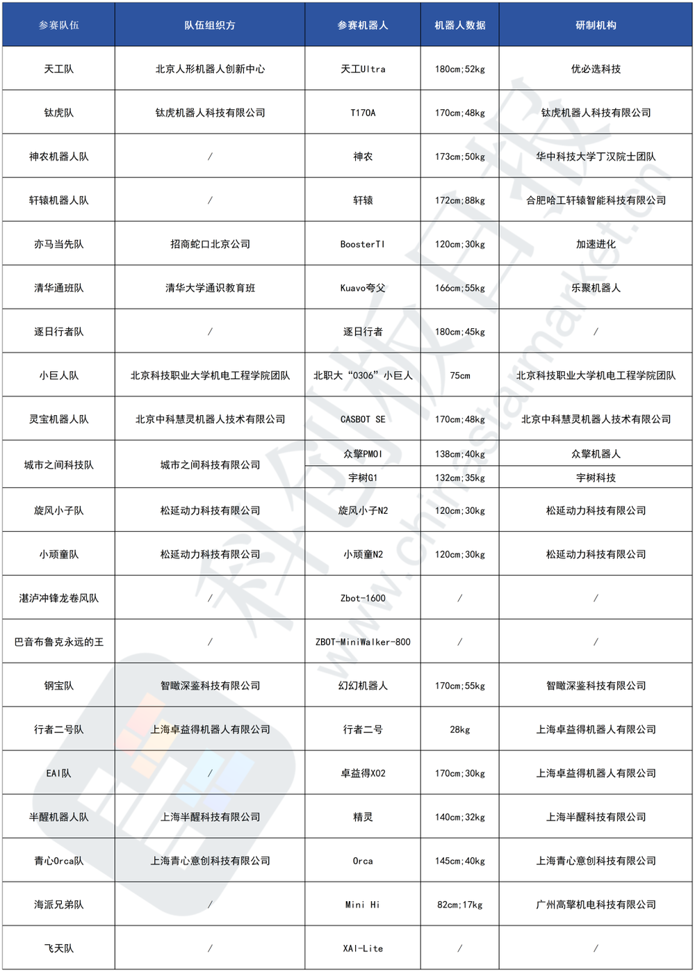 此次共有21支队伍参赛,其中既有来自企业或研究机构的队伍,也有清华大学、北京科技职业大学等高校科研组织。根据《科创板日报》基于公开信息统计,已知有7家企业将携自家研发的机器人参赛,其余机构则大多选择安排第三方机器人完成比赛。