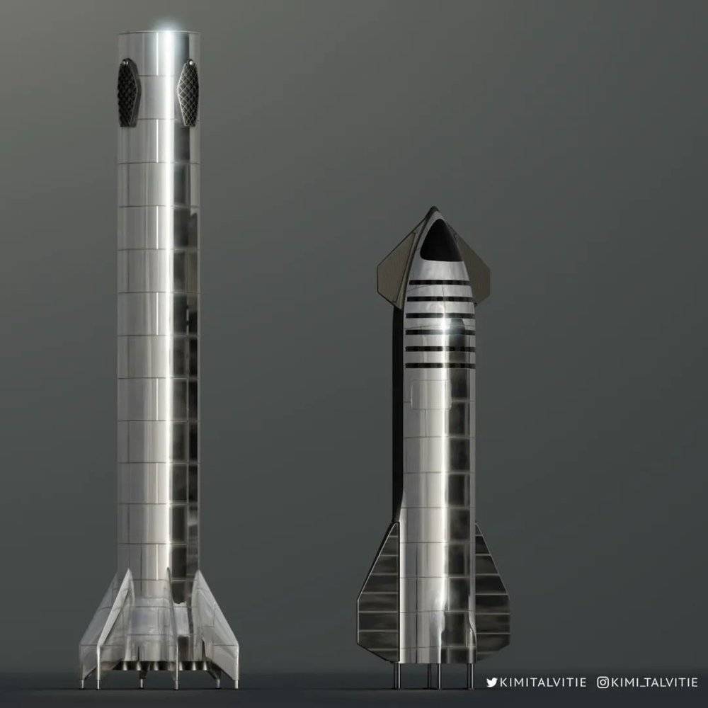 当下,我们在提到星舰这个称呼时,特指第二级的飞船部分,就是目前正在测试的部分。飞船部分高50米,直径9米,重约1300吨,安装有3台真空版猛禽发动机和3台海平面版发动机。托举飞船的是一枚更加强大的超重火箭(Super Heavy),这种火箭高72米,直径9米,重达3500吨,安装有28台猛禽发动机。飞船部分加上超重火箭后的总高度达120米,近地轨道运载能力超过100吨,一次性可将100名乘客送上太空。