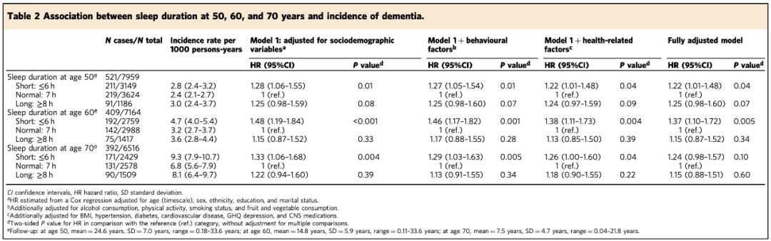 截止至研究结束时,50岁、60岁和70岁年龄段的研究人群分别经过了24.6年、14.8年和7.5年的平均随访时间。在仅调整社会人口学因素的Cox回归模型中,研究人员在全部年龄段的研究人群中均发现,更短的睡眠时间与更高的痴呆症发病风险相关。