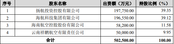 扬航投资控股39.3532%(为海航航空集团控股,天津航空、大新华快运参股);