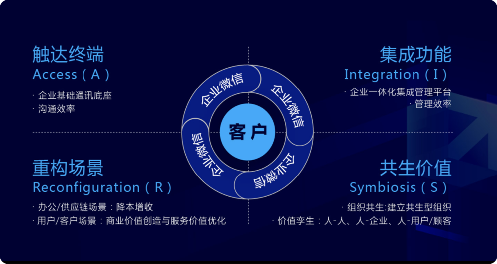 “不止是人,借助企业微信开放的API接口,企业可以把自己的业务经营系统集成到企业微信的工作台上面。这又就成了‘AIRS价值增值环’的集成板块。而当企业将这些业务集成下来,并将其与企业微信的通信功能有机结合时,很多场景都可以被数字化重构起来。”黄铁鸣说。