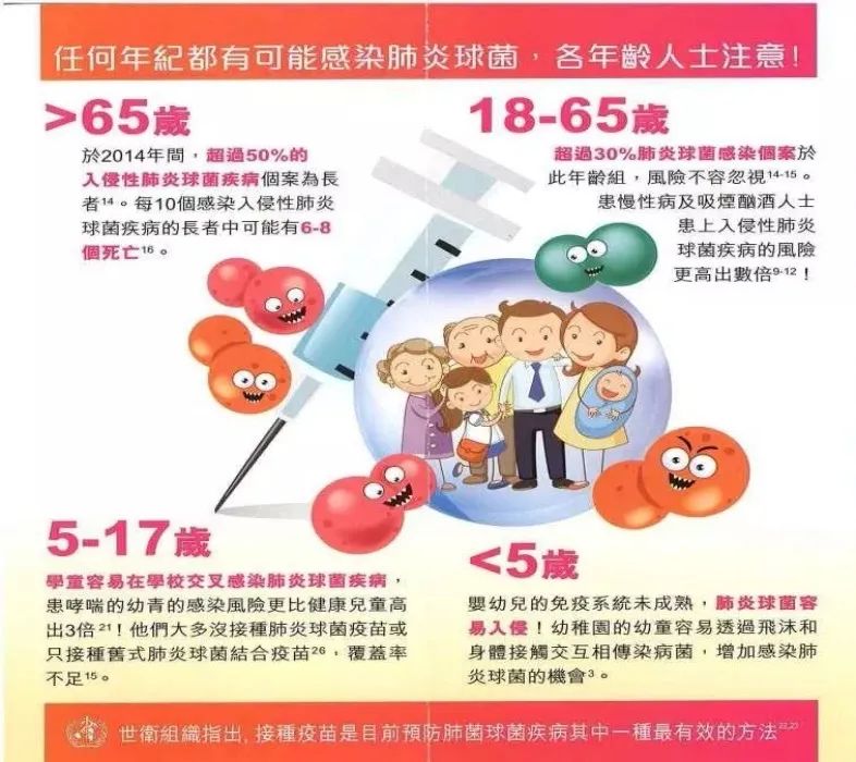 中华预防医学会疫苗与免疫分会编写的《肺炎球菌性疾病免疫预防专家共识(2017版)》指出,成年人易感人群和危险因素,包括年龄>65岁。有统计数据显示,老人肺部感染的死亡率为36%,而80岁以上老人肺炎的死亡率则在50%以上,在世界卫生组织2018年发布的一个公报中,下呼吸道感染位居死因的第四位。是80岁以上高龄老年人的首位死因。