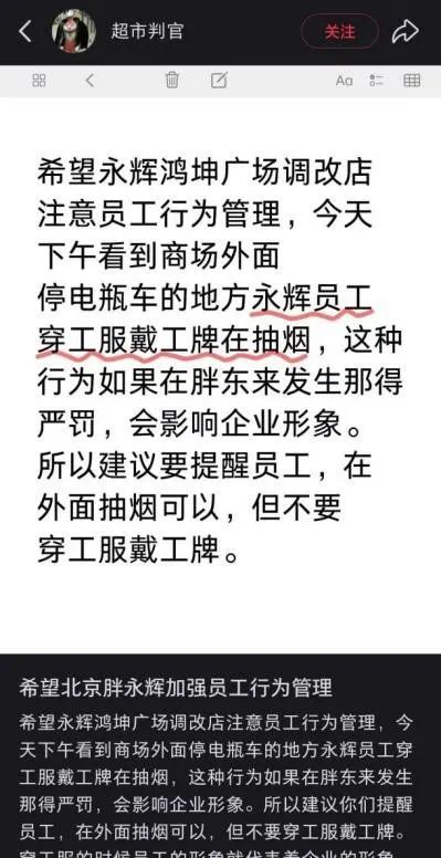 一个细节是,当日离开超市时,《BUG》栏目发现,存在超市员工在户外身着工服工牌抽烟的情况,这一点也有小红书用户反馈过类似情况,说明并非个例。