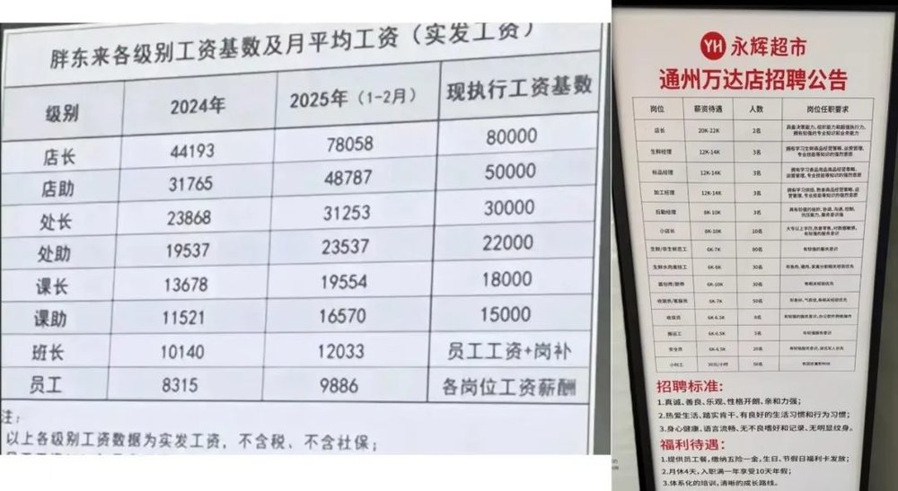 根据通州万达店永辉超市招聘公告,永辉调改店的店长工资最高为2.2万元,而胖东来的店长工资为7.8万元;普通员工(售货员)的最高工资为6500元,胖东来员工则为9886元。
