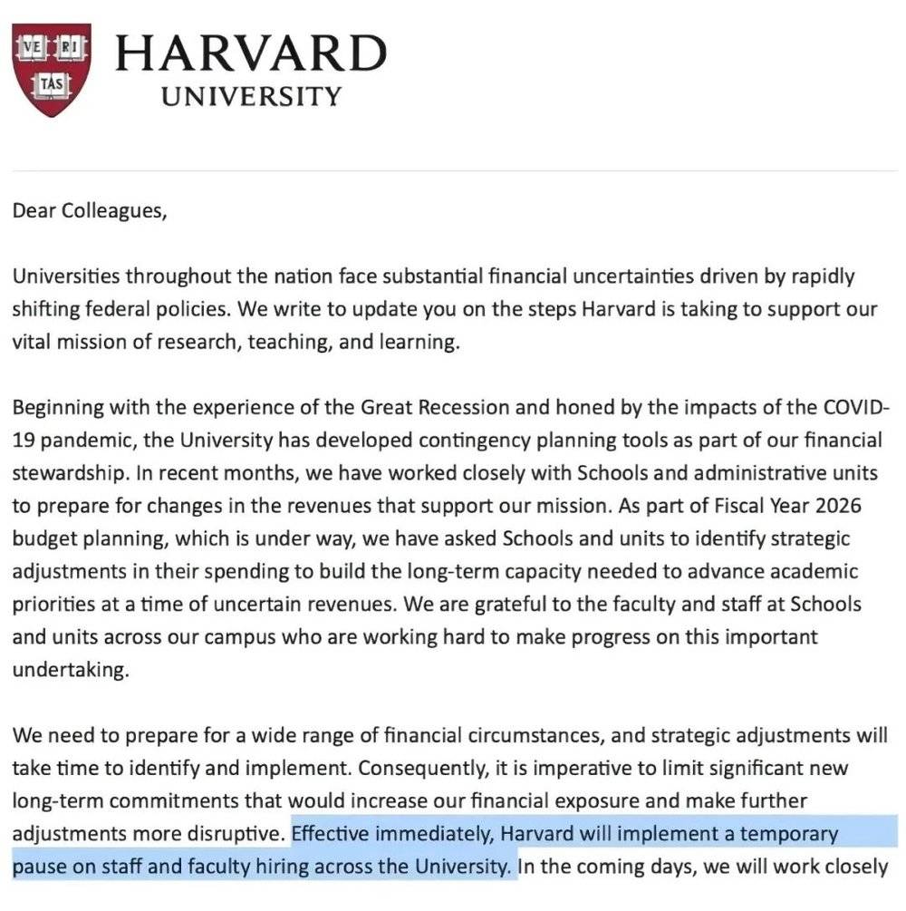 哈佛大学宣布将暂停教职工招聘事务