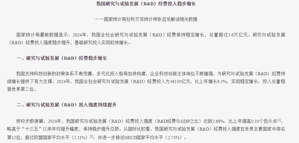 与美国科研经费缩减相比,我国在科研经费方面的投入持续增长。根据国家统计局发布的数据,2024年我国全社会研究与试验发展(R&D)经费投入超过3.6万亿元,为36130亿元,比上年增长8.3%;研究与试验发展(R&D)经费投入强度达到2.68%。这一数字不仅体现了政府对科技创新的高度重视,也反映了中国经济转型升级过程中对科技依赖程度的提升。