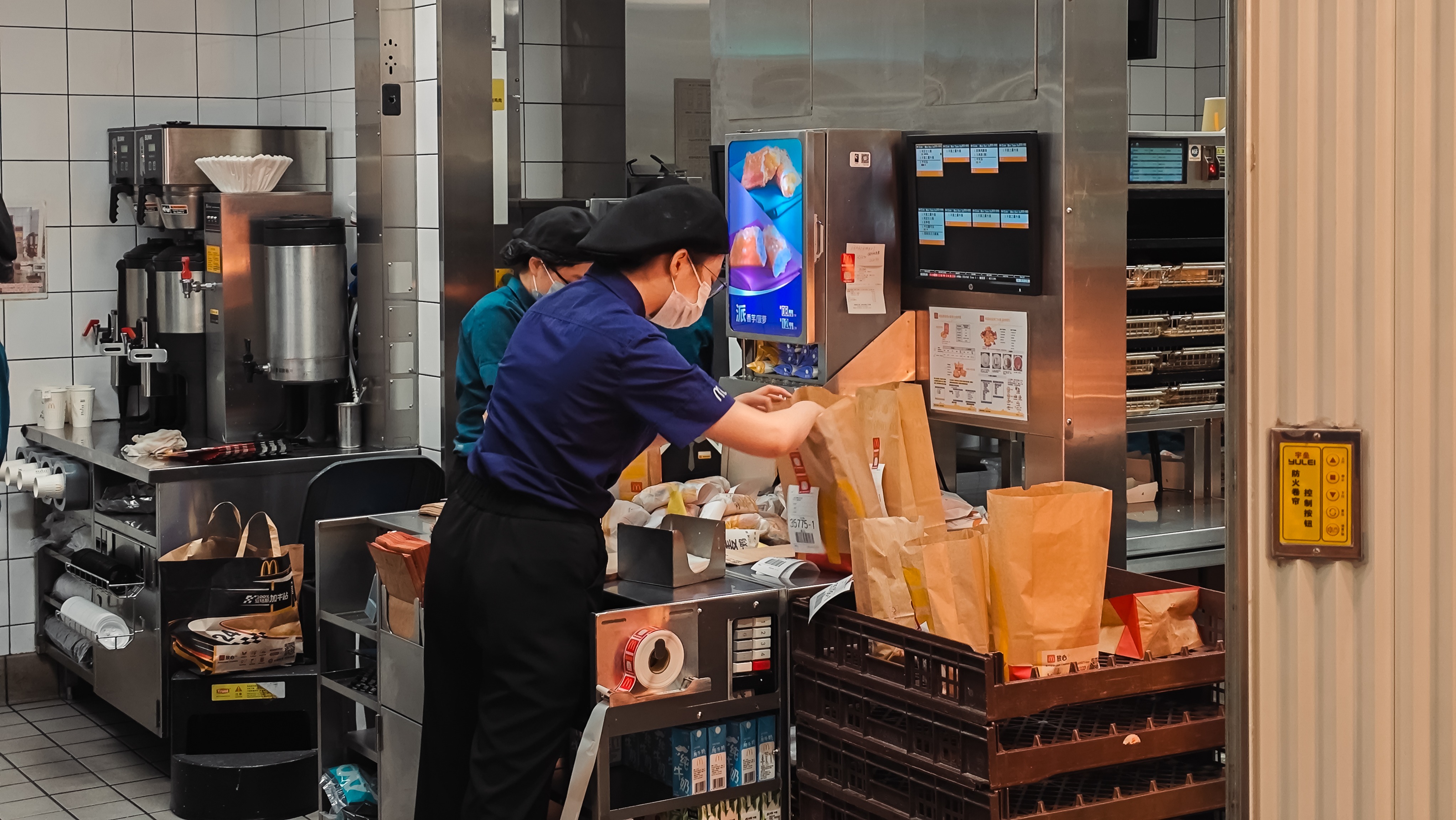 过去麦当劳柜台最忙时需要十几个员工,现在高峰期往往也只有两个人值守,平常时段只有一个人。即使是24小时营业的门店,两个员工就能完成3000多元的营业额。关键在于不断迭代设备、优化人员配置和动线设计。
