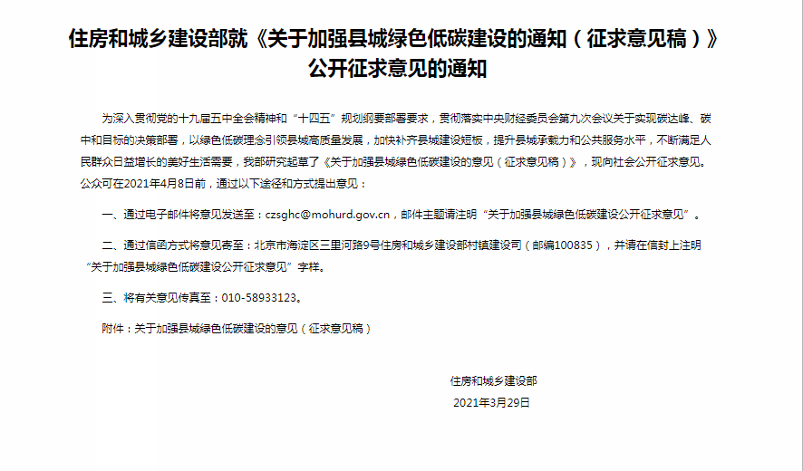 3月29日发布的《关于加强县城绿色低碳建设的通知(征求意见稿)》更是将目标锁定为县城,《通知》指出,目前县城在取得建设新成就的同时,还存在规模无序扩张、布局不合理、密度和强度过高、基础设施和公共服务设施能力不足、人居环境质量不高等问题。