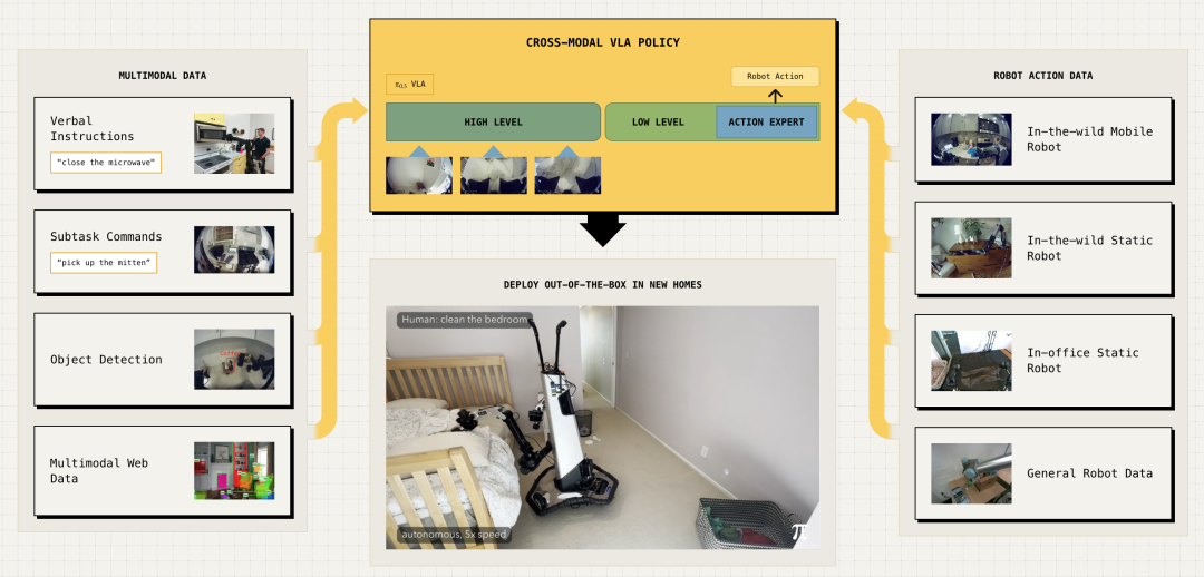 图|π0.5 的协同训练任务示意图,其中包括来自多种不同机器人类型的各种机器人数据源,以及包括高级子任务指令、指示和网络数据在内的多模态数据。