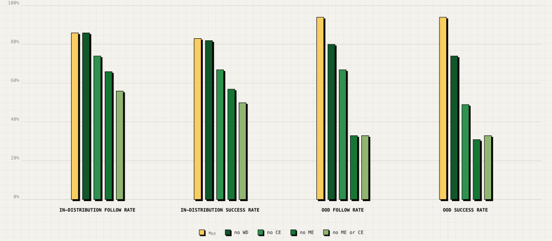 图|评估完整的 π0.5 训练混合与排除各种数据源的消减相比。网络数据(WD)在泛化到分布外对象方面的差异最大,而来自其他机器人(ME 和 CE)的数据在所有评估条件下都很重要。