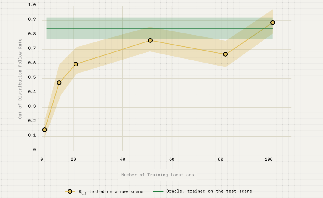 图|评估在与训练混合中的其他数据集共同训练时,性能如何随训练环境的数量而变化。当使用所有可用的训练环境时(图中最右边一点),π0.5(黄色)与直接在测试环境(绿色)中训练的基线模型性能相似。