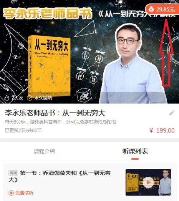 李永乐也曾尝试做过一个《从一到无穷大》解读的课程,售价199元。尽管他没有对外公布课程的销售数据,但视频下的评论数量和弹幕是窥探销量的一个窗口——几乎都是个位数,且大多集中在2020年前后。