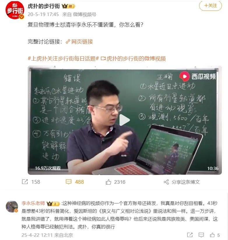 最近,他在微博上跟人“打架”。对方是一个自称是复旦物理学博士的博主,曾经批评过李永乐的一条科普视频,其中不乏“不懂装懂,脑子不好使了,跟他学你就完了,这种人(指李永乐)可能有点问题”等侮辱性词汇。此前,这名博主还用“民族败类、美国间谍”这样的词语形容过李永乐。