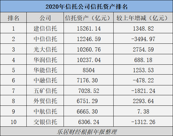 兴业信托和五矿信托,2020年信托资产较上年分别减少1848亿元和1821亿元。此外,渤海信托、交银信托压降规模也在千亿以上。