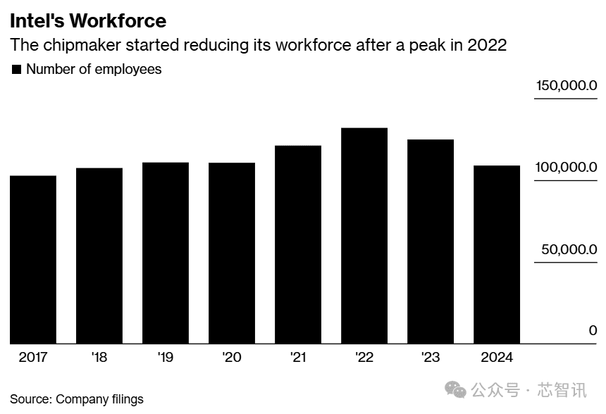 去年8月,英特尔就曾因“财务危机”爆发而被迫宣布削减100亿美元成本计划,其中包括全球裁员15%,即削减约15000个工作岗位,目标是在2024年底之前完成。根据财报数据显示,截至2024年底,英特尔旗下仍拥有108900名员工。