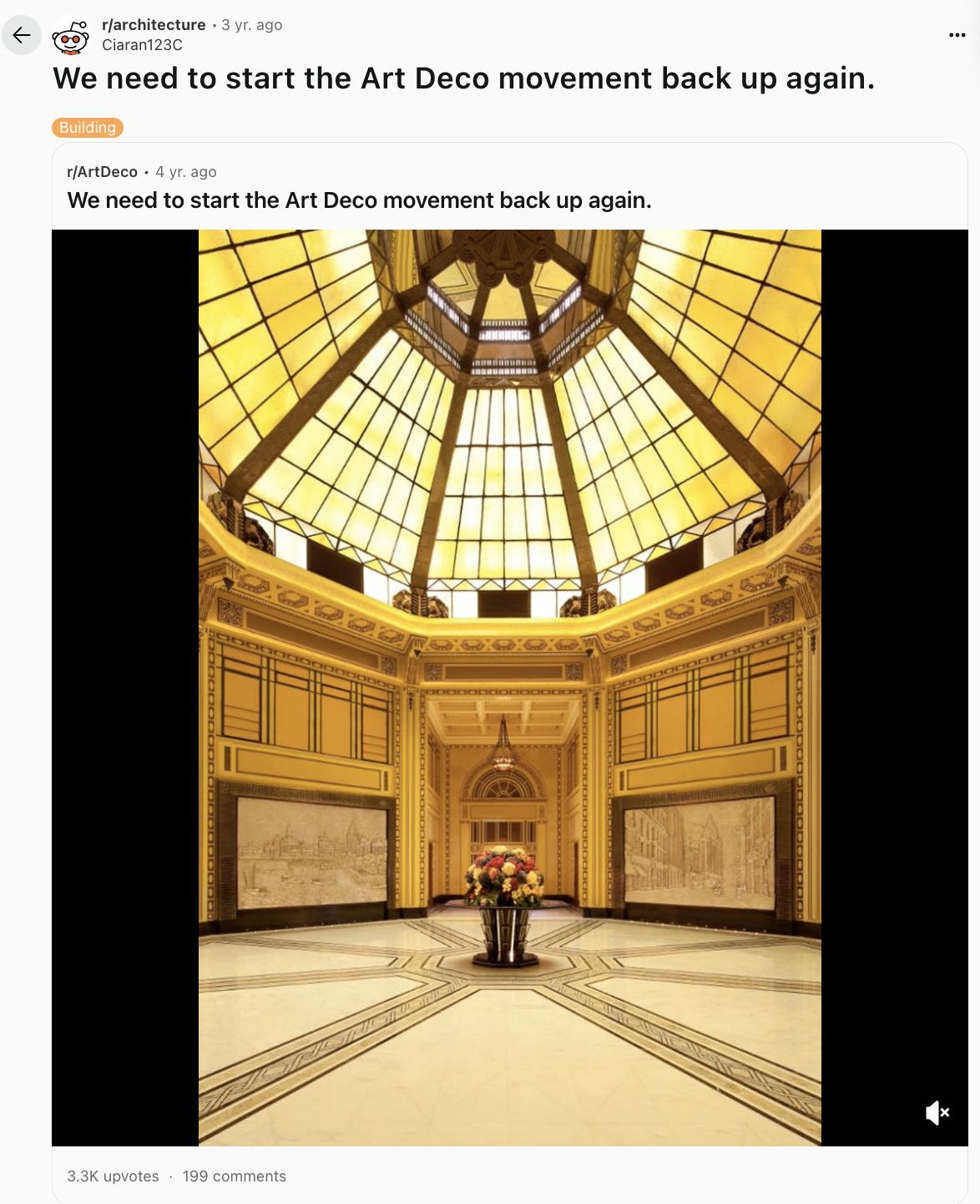 3年前,reddit上就有人在建筑板块发起了呼唤装饰美学回归的招魂贴,点赞、跟帖的人不少,有些人声称极简主义太无聊了,缺乏活力,唯有这种繁复奢华的装饰美学才是令人振奋的风格。