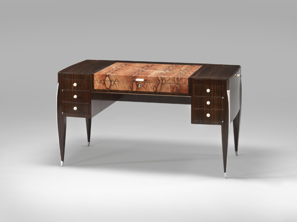这张桌子,用料奢侈,主体使用了望加锡乌木构建,运用东方漆艺修饰,桌面用非洲莽蛇皮覆盖,桌脚使用了镀银青铜加固,最后再用象牙点缀部件。