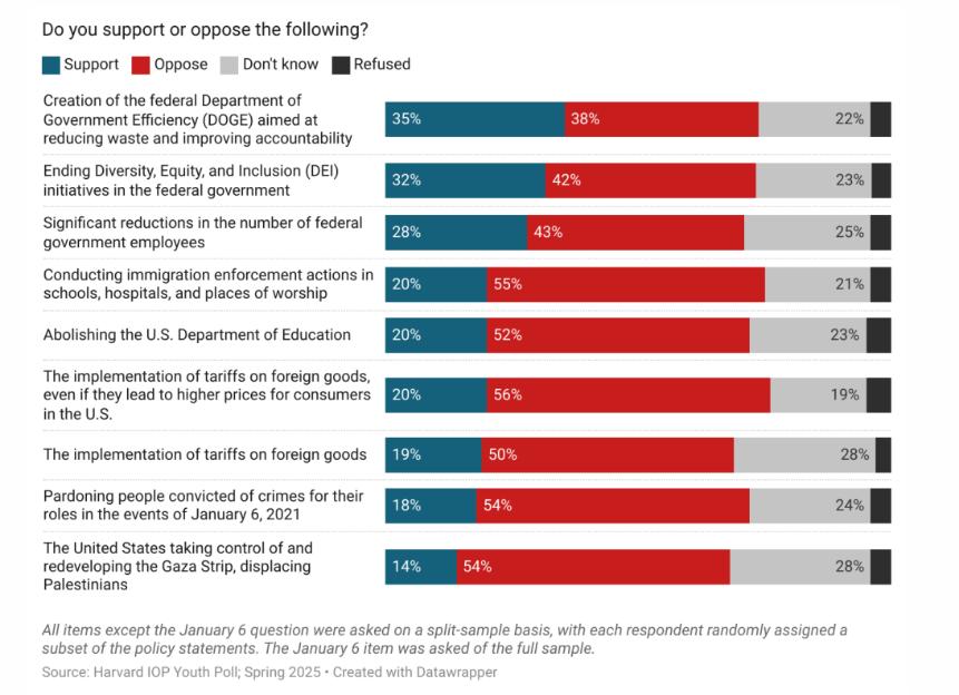 最受欢迎的提议是成立政府效率部(DOGE),但这也只有三分之一的年轻人支持。其余的议程,包括在联邦机构中终结多元化及平等(DEI)原则、关税、移民政策、减少联邦机构雇员、废除教育部、赦免2021年的国会骚乱者等,每项的支持率都在20%及以下。