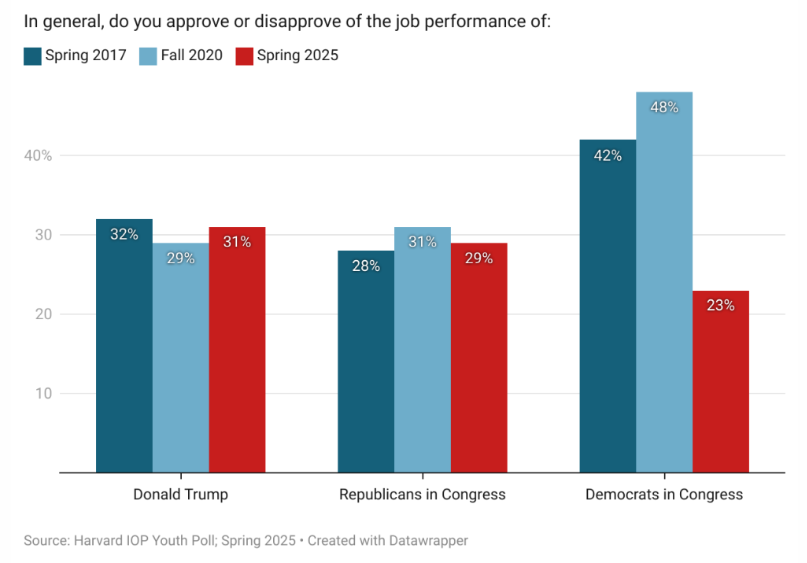 这项民意调查还显示,到目前为止,对特朗普执政感到满意的人相对较少:特朗普在美国年轻人中的工作支持率只有31%,与他第一个任期同期(2017年春季)的比例几乎没有变化。