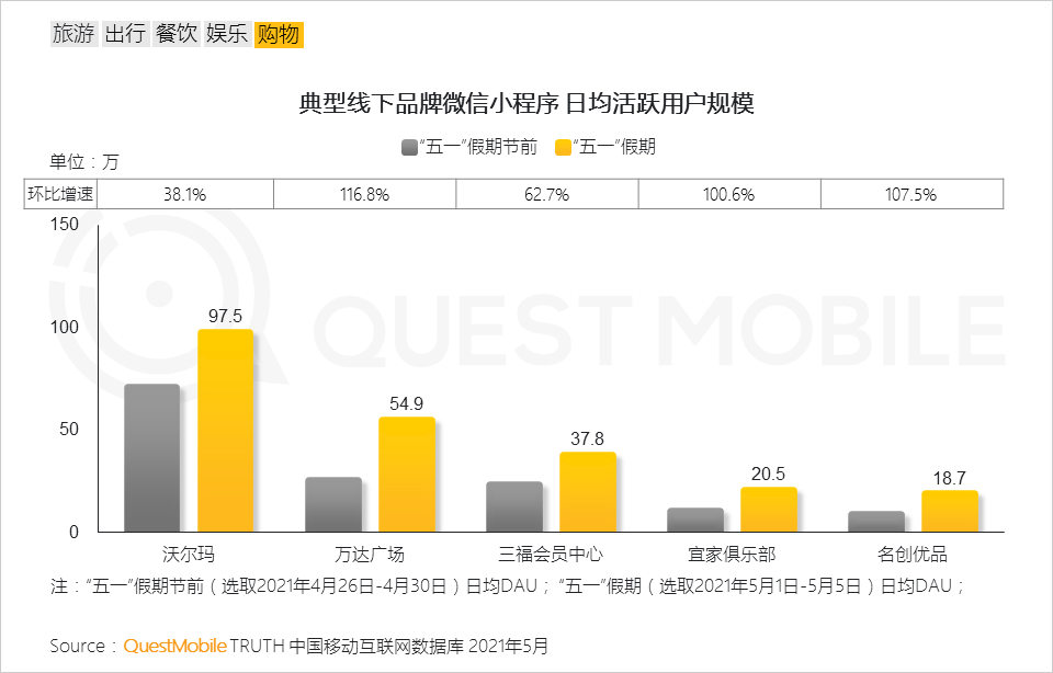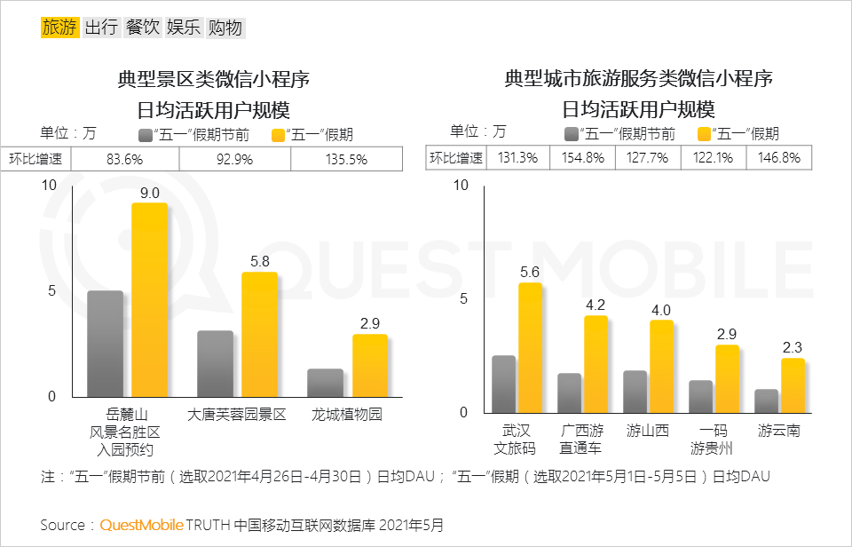 4. 小程序与日常生活场景的链接不断加深,“五一”假期期间,生活服务、旅游服务、出行服务类微信小程序用户规模增长明显。
