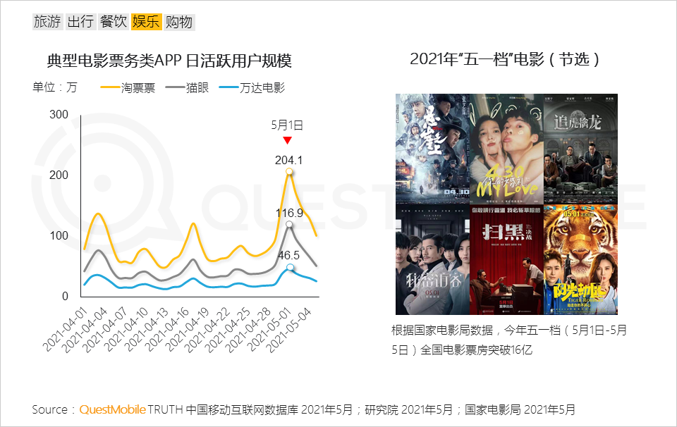 4.1 五天的长假吸引十余部电影定档“五一”,覆盖谍战、青春、悬疑、喜剧等多种题材类型,让不同年龄层的观众在观影时有了更多的选择余地,观影需求助推电影票务类应用迎来继春节档后又一高峰。