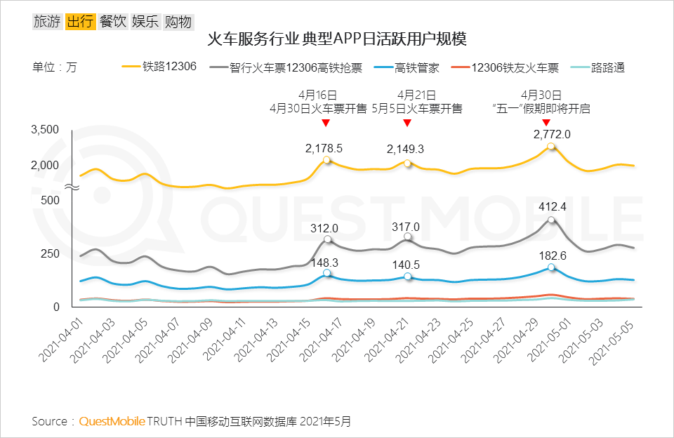 根据QuestMobile数据,铁路12306 App在2021年4月30日日活跃用户规模达2772万,为该App近3年日活跃用户规模峰值。