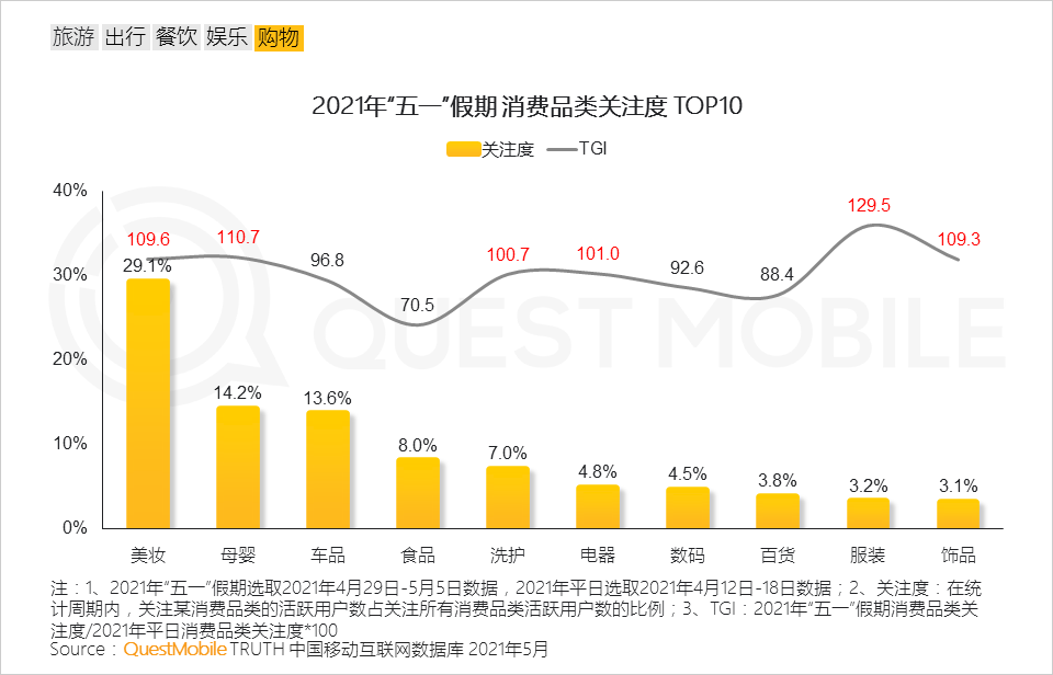 5.2 “五一”假期,用户对消费品关注度主要集中在美妆、母婴等女性向品类,与平日相比,服装、母婴、美妆等品类在假期关注度更为突出。