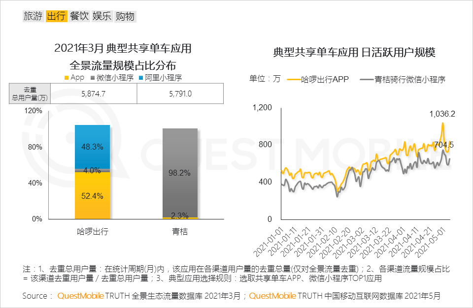 2.6 共享单车让游客在游览观光过程中多了一种出行方式的选择,“五一”假期期间行业头部应用流量增长明显,小程序已成为重要流量来源。