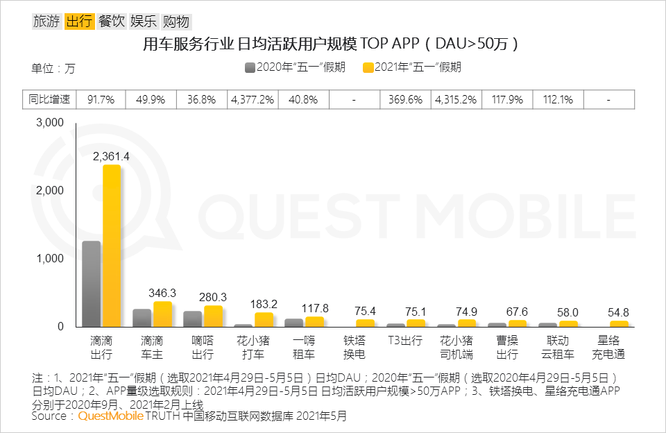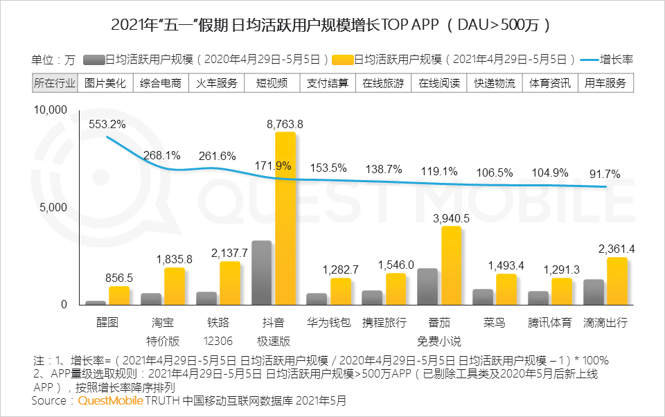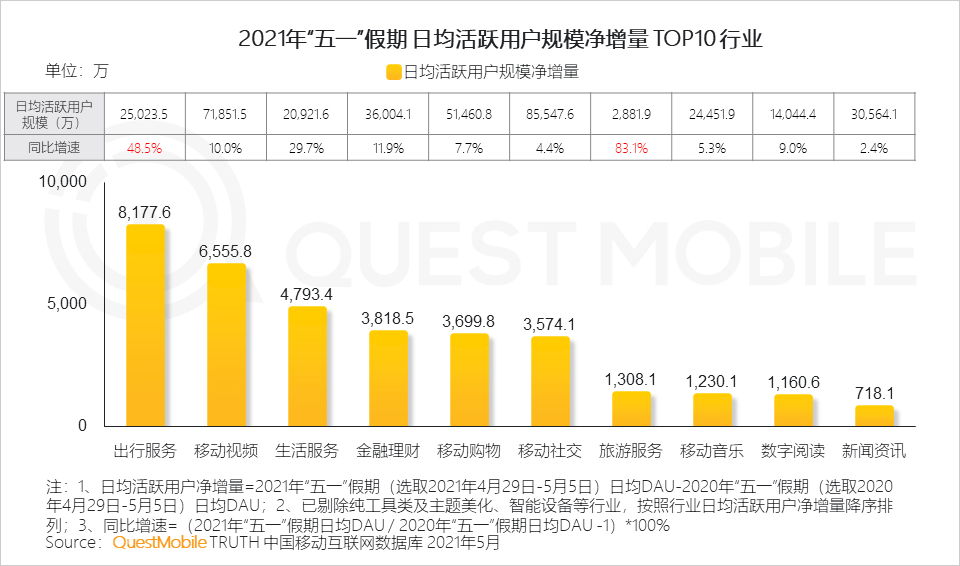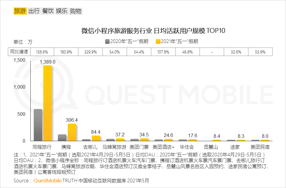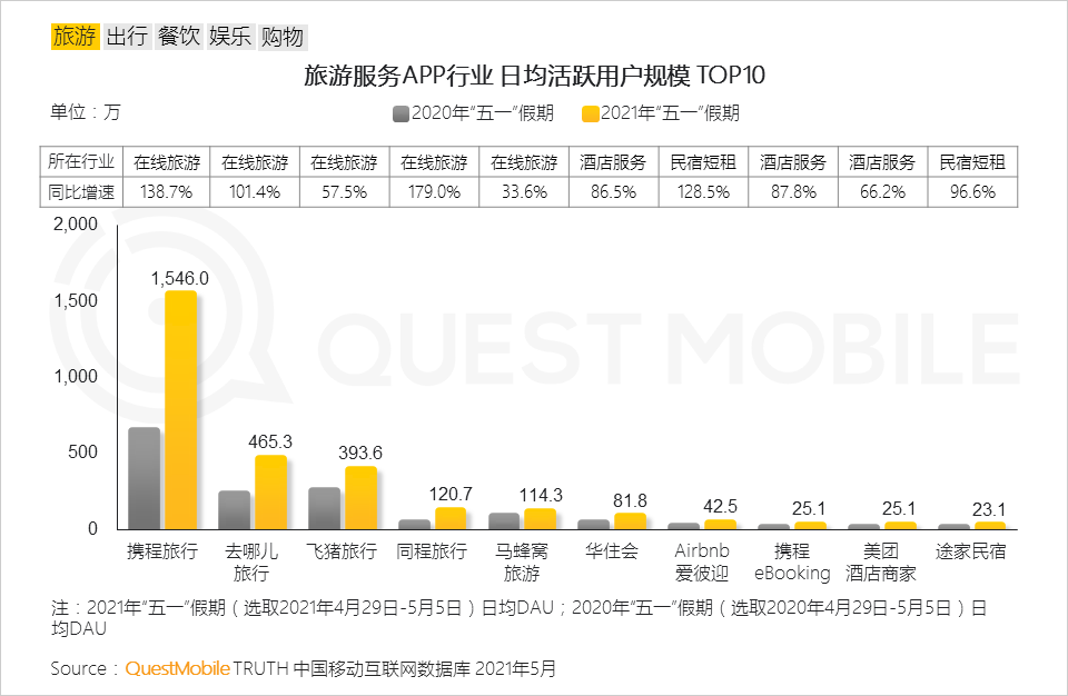 1.2 疫情、春节原地过年等多重因素挤压下的旅游需求在今年“五一黄金周”集中爆发,旅游出行、酒店、民宿等服务应用全线增长。