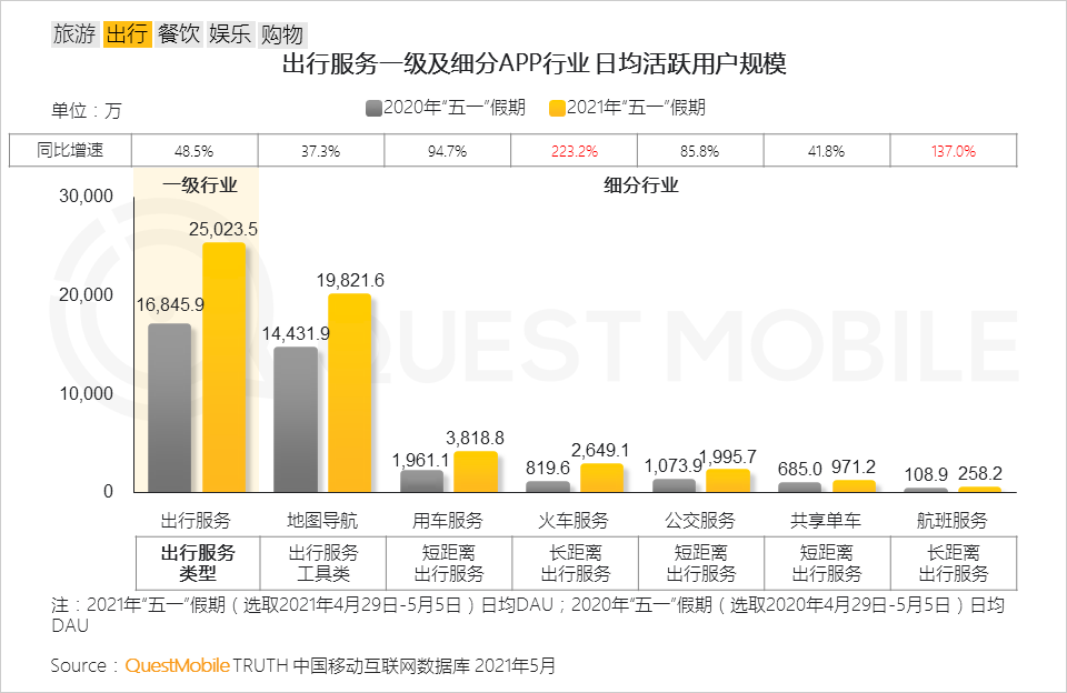 2.1 旅游及探亲需求带动下,“五一”假期用户出行热情高涨,尤其是以火车、航班为主的长距离出行服务,用户规模实现一倍甚或两倍增长。