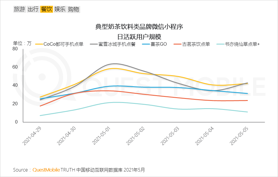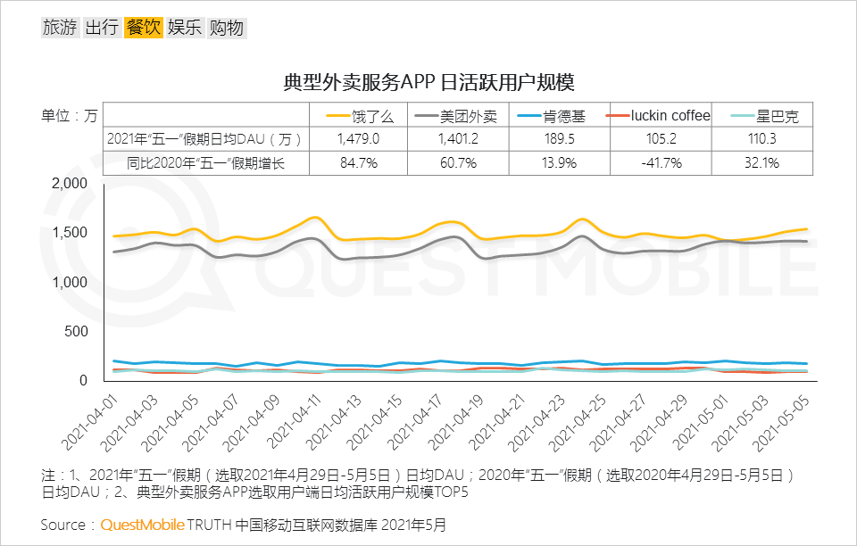 3.2 宅家饮食以及酒店、景区等场景外卖需求带动下,饿了么、美团外卖等APP同比去年提升显著,奶茶饮料品牌微信小程序随着“五一”假期的到来也迎来流量高点。