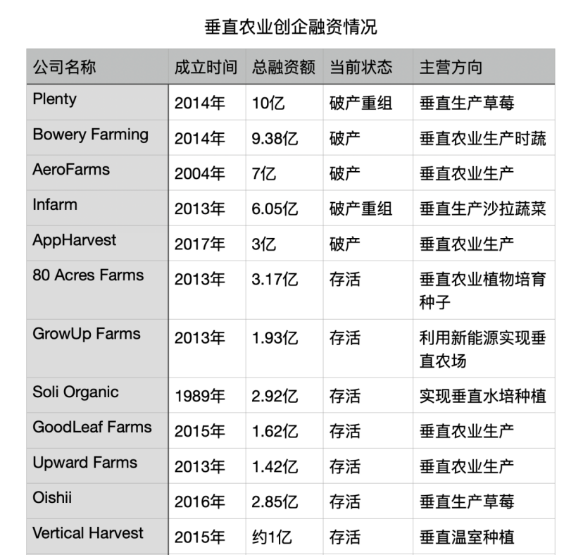 垂直农业创企生存情况|硅兔君根据公开资料整理并制表