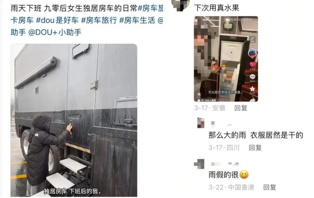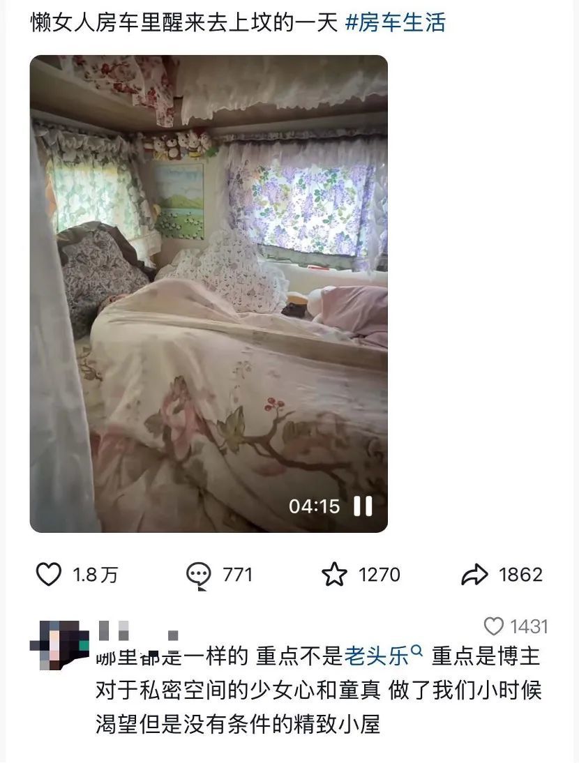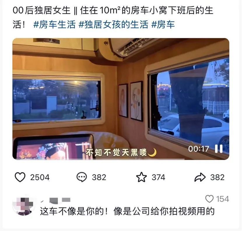 “月入XX万精致房车露营”展示则是另外一种系列:没有使用痕迹的车辆细节,窗外的美丽风景,以及合租房没有的独立感。