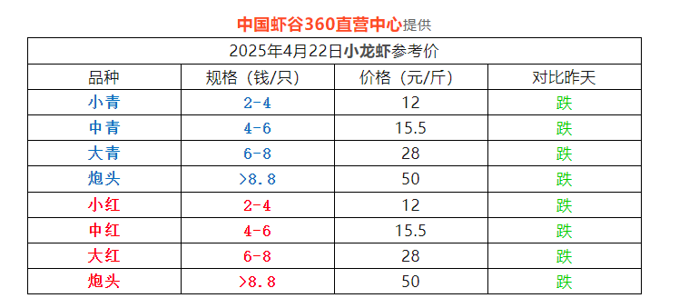 小龙虾垂直电商平台“虾谷360”,每天都会发布价格信息。其官微显示,4月22日,4~6钱/只的中青、中红的报价为15.5元/斤,6~8钱/只的大青、大红报价则为28元/斤,而且各个规格的小龙虾环比前一日均在下跌。而早前的4月2日,同等规格的小龙虾价格还为37元/斤、53元/斤。短短3周,小龙虾的价格近乎腰斩。