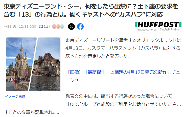 如果说大阪世博会的事件是一次警醒,那么东京迪士尼的最新举措则更像是一记重拳。4月18日,东京迪士尼乐园和迪士尼海洋的运营方オリエンタルランド(Oriental Land)发布了一份重磅声明,宣布制定针对顾客骚扰的“基本方针”。这份声明不仅明确了顾客骚扰的定义,还列出了13种可能导致“永久禁入”的行为,其中包括“要求员工下跪”“言语侮辱”“身体攻击”等。消息一出,社交媒体上炸开了锅,有人调侃:“这下在迪士尼耍横可要三思了!”