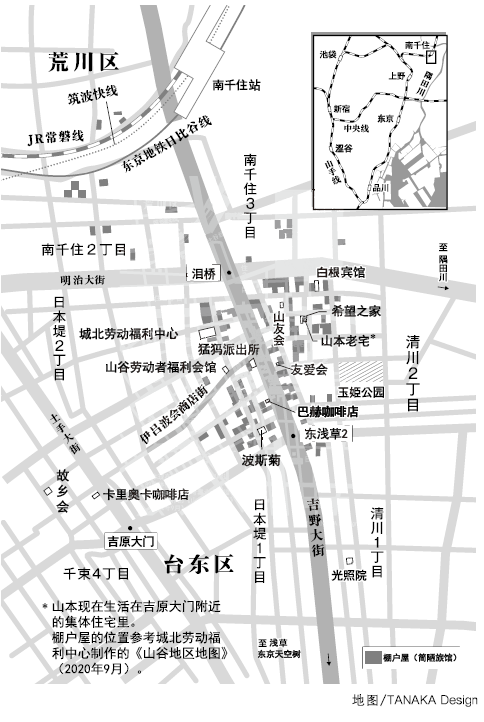 但是现在,横跨东京都台东区和荒川区的约1.7平方公里的区域被统称为山谷地区,该地区密布着简易宿舍,也就是常说的棚户屋。所谓“棚户屋”是一个隐语行话,将意为旅馆的“宿”字倒过来念,意指不能称为旅馆的简陋旅馆。