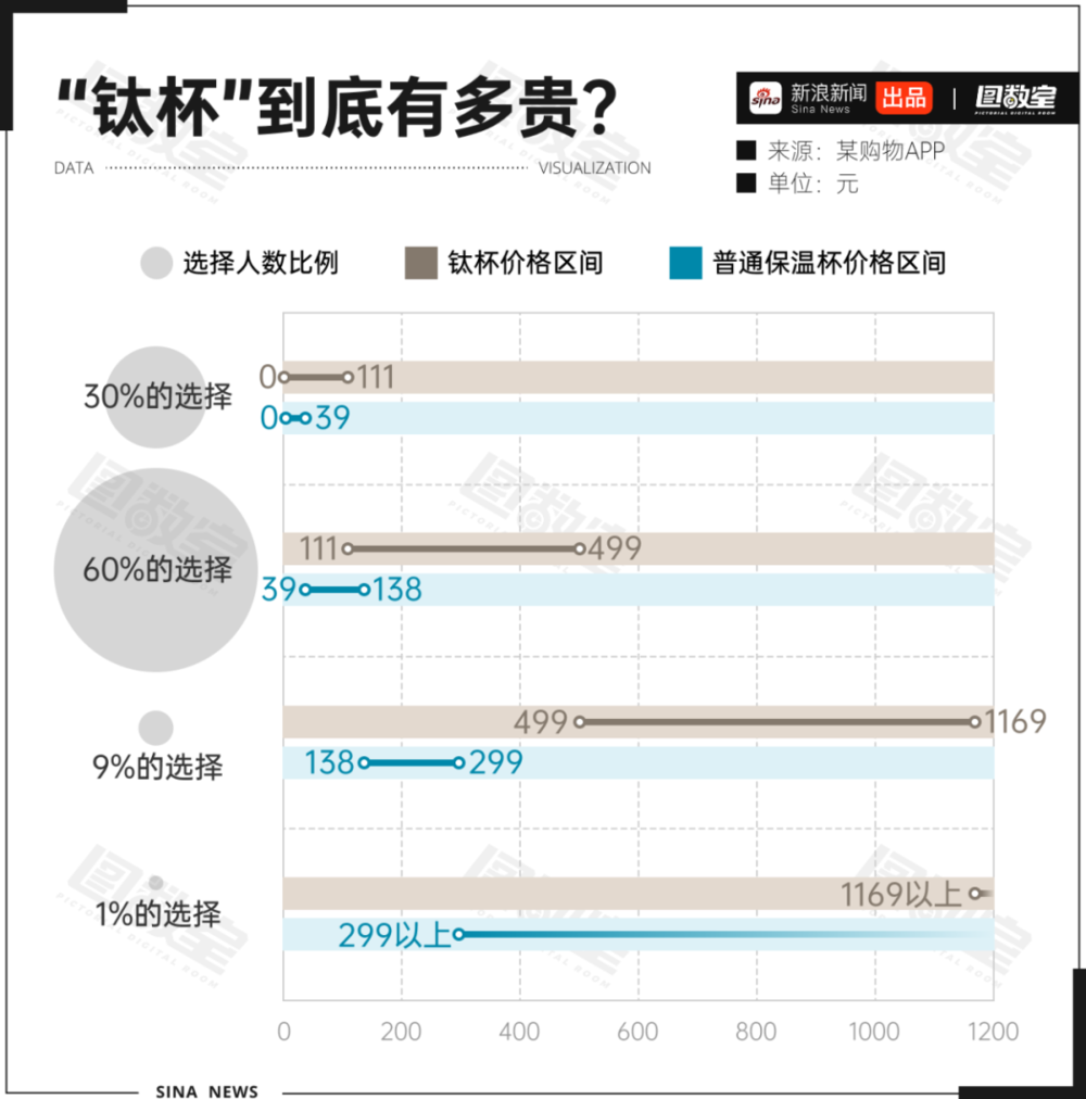 钛杯的定价并不低。在钛杯市场,消费者的选择主要集中在111~499元区间,占比高达60%,其次是0~111元区间,占30%,高端市场(499~1169元)占9%。