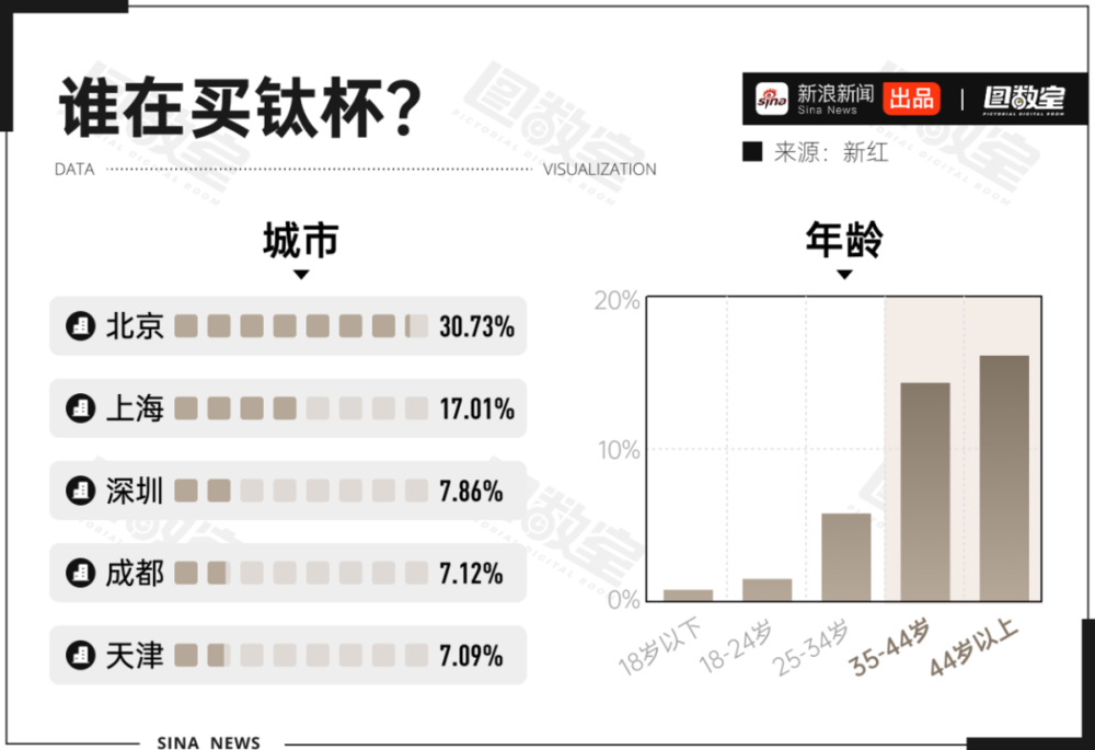 通过查询小红书有关钛杯的用户画像,图数室发现,北上深一线城市、35岁以上的用户是主要消费者。