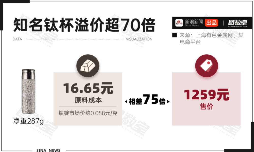 某品牌钛杯净重287克,按照0.058元/g计算,材料成本仅16.65元,而它的售价高达1259元,溢价75倍。