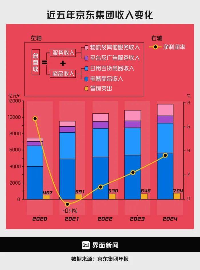 内部近年来的业绩或许能更直观地反映其紧迫感。2019年以来,京东核心零售业务增速持续放缓,从2020年的36.8%降至2023年的1.7%,增长近乎停滞。