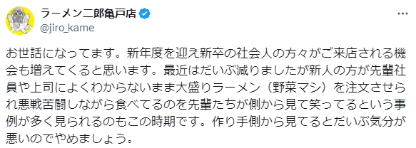 然而,最近这种重量级拉面却卷入了一场职场风波——“拉面二郎”龟户店在社交平台X上郑重呼吁:“请不要再在职场聚餐时强迫新人点大碗拉面”。这到底是怎么一回事?