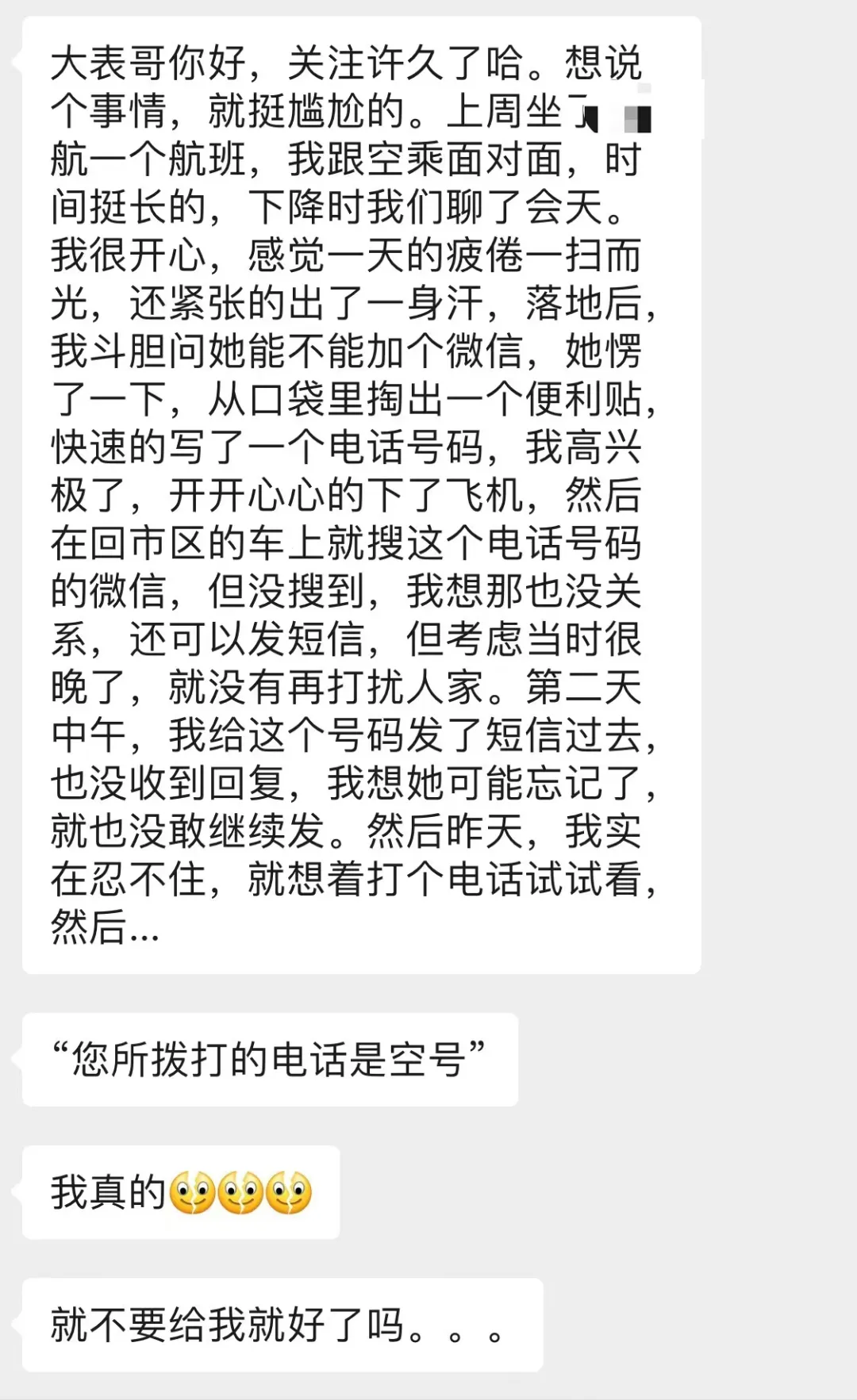 不管是不是在飞机上,不管是不是面对空乘,女孩子不想被打扰又不想费口舌,写一个假的电话号码确实是最省事儿的办法。而飞机上,又先天的给了我们一个便利:那就是有旅客在的时候手机基本都关机。