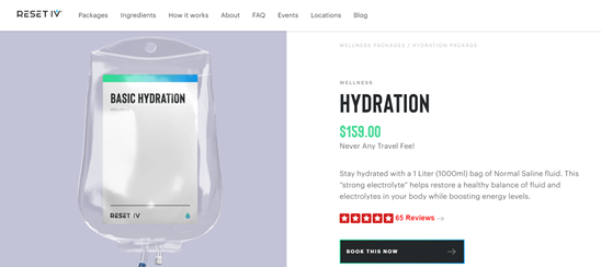 跟NutriDrip比起来,Reset IV的价格高得离谱——即便是一瓶1000毫升的生理盐水,价格也要159美元。