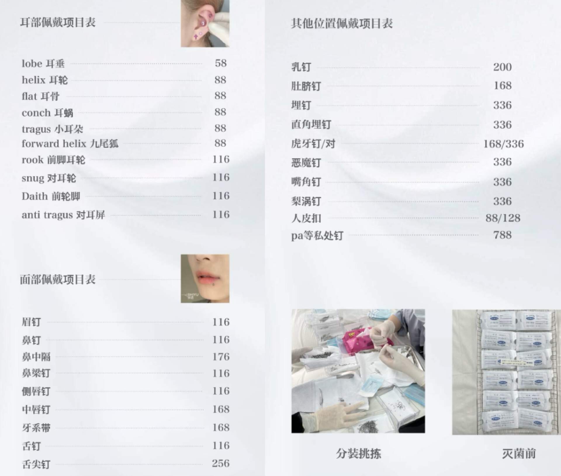 从价格来看,单次穿孔加基础饰品的花费大概仅一两百。比如,瑶瑶的唇钉和舌钉都是200块出头;可恩的服务价格在88~336元不等,如果想打在私密部位的话,价格则再高一些。