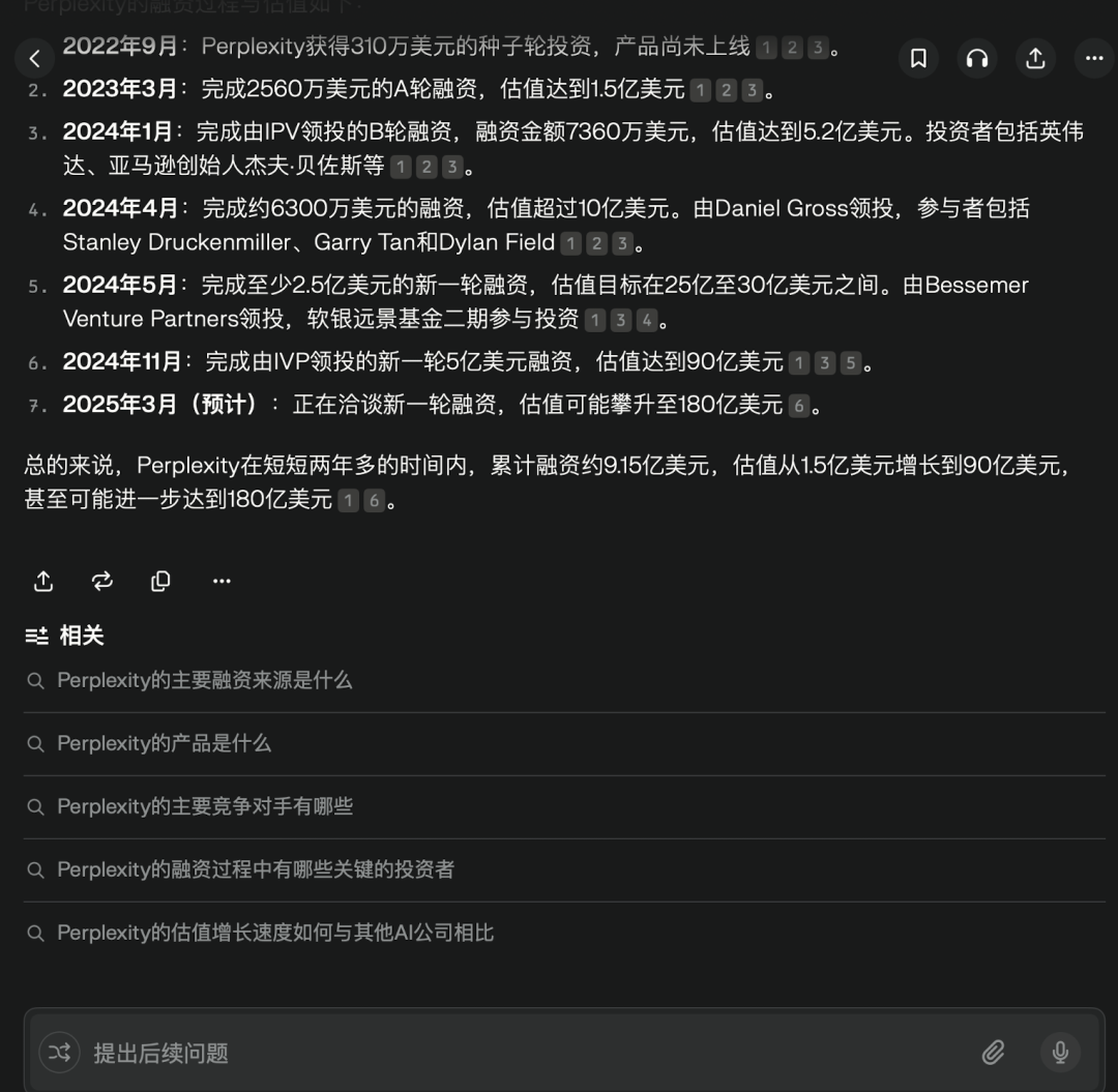 我一直认为提问是一个人非常重要的能力,但想出一个好问题是很难的。Perplexity不断延展相关问题,在我看来,这是它最大的价值。