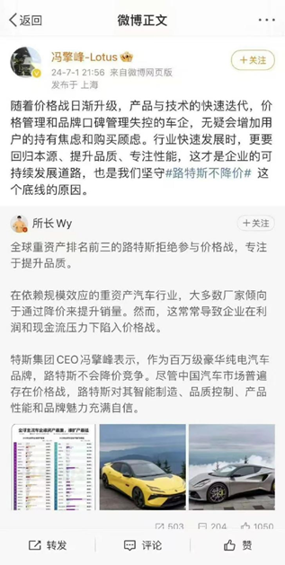 半年多前,莲花CEO冯擎峰表示:“随着价格战日渐升级,产品与技术的快速迭代,价格管理和品牌口碑管理失控的车企,无疑会增加用户的持有焦虑和购买顾虑。行业快速发展时,更要回归本源、提升品质、专注性能,这才是企业的可持续发展道路,也是我们坚守莲花不降价这个底线的原因。”不过目前,冯擎峰本人已经删除该条微博内容。